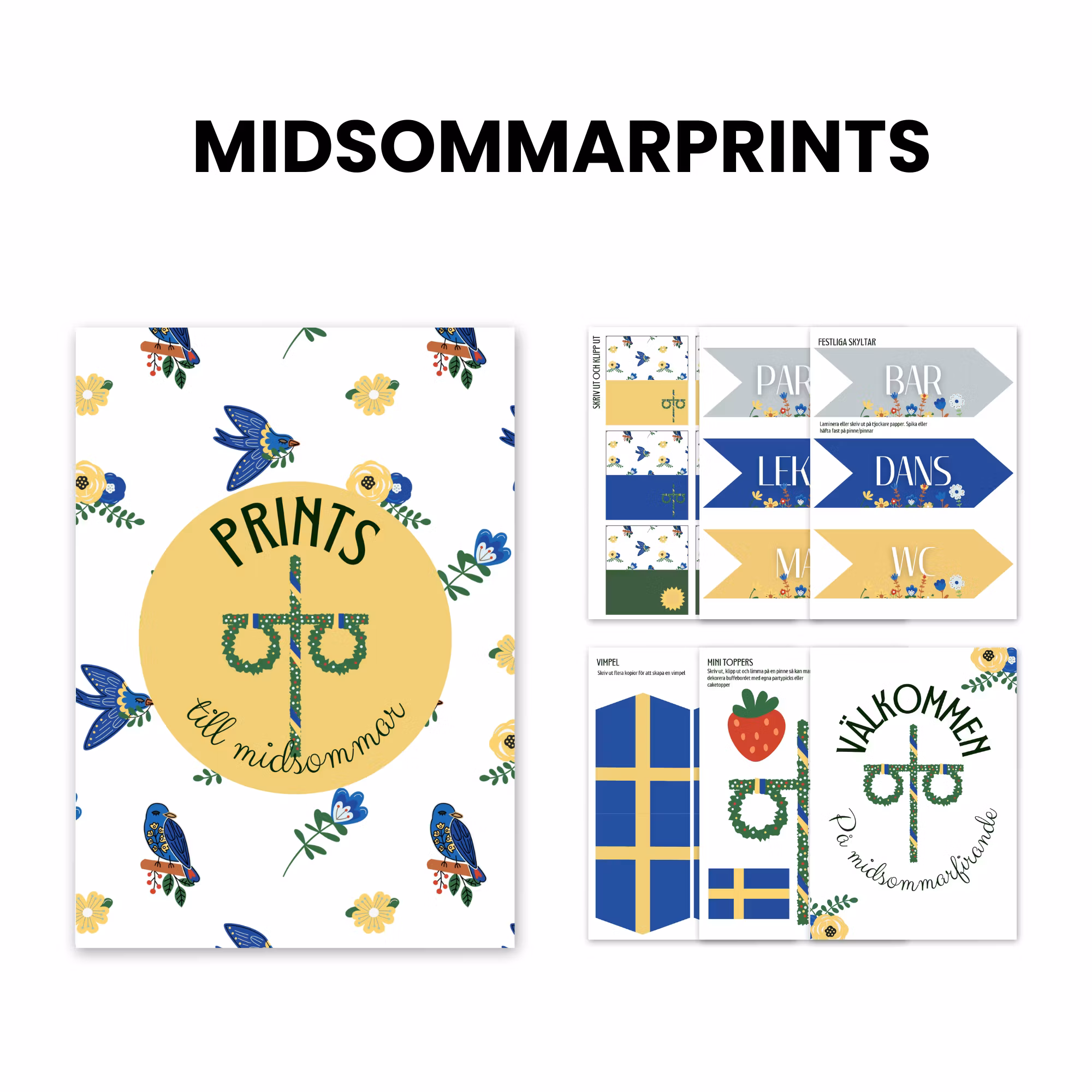 Midsommardekorationer att skriva ut! Roligt pyssel och fina dekorationer till midsommar. Bla roliga skyltar och girlang. Den här produkten är en PDF (digital) fil som kommer direkt till mailen efter köp.